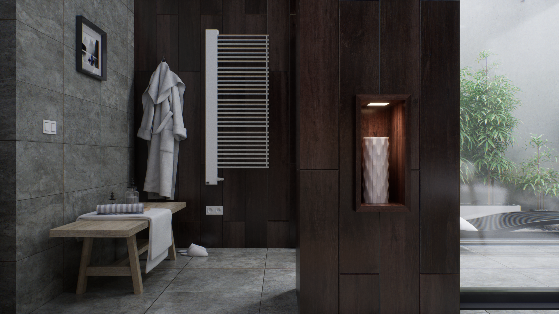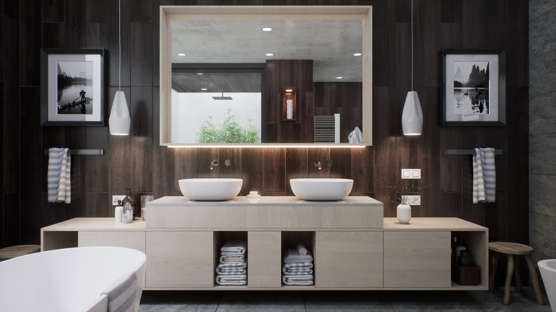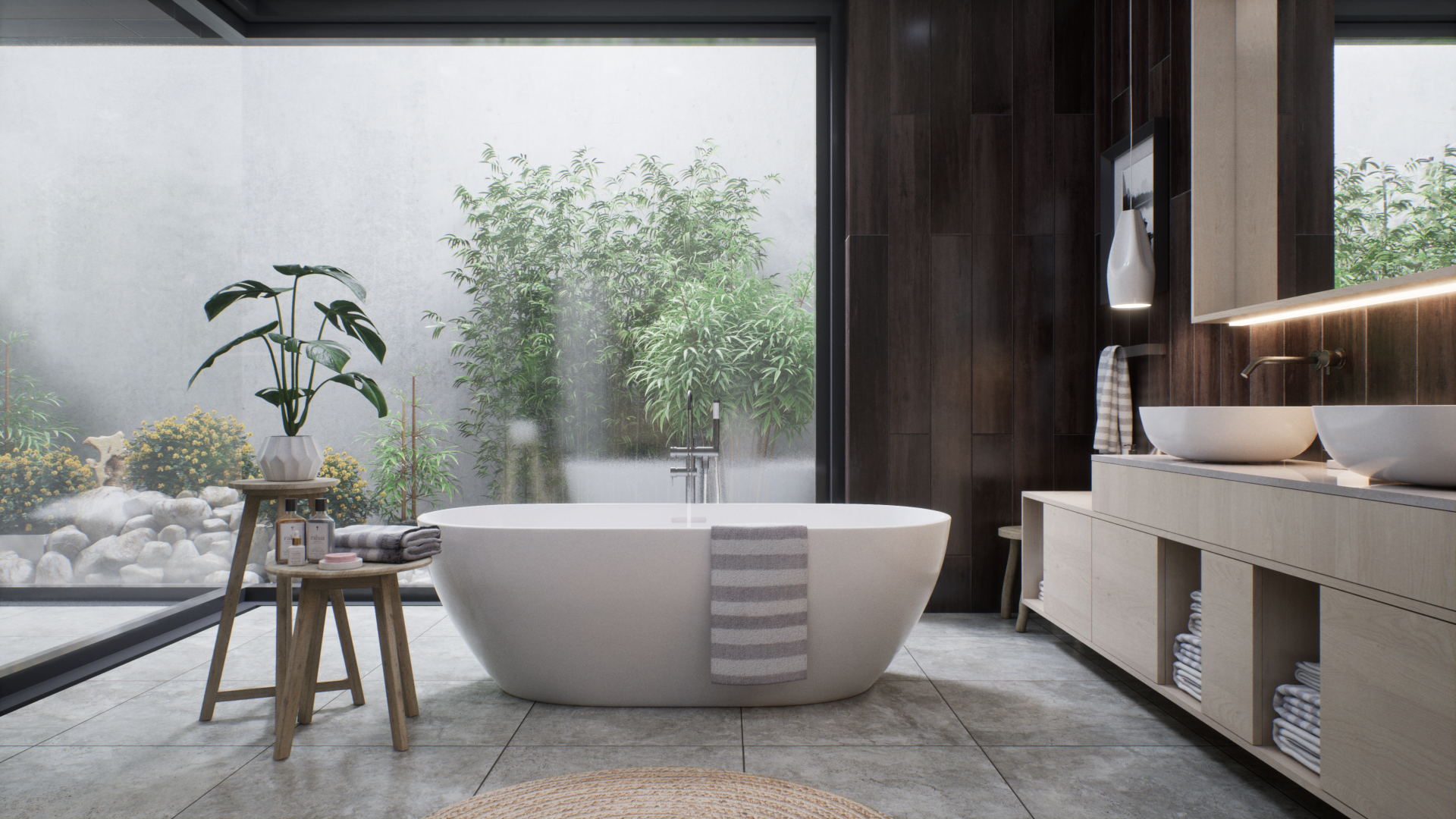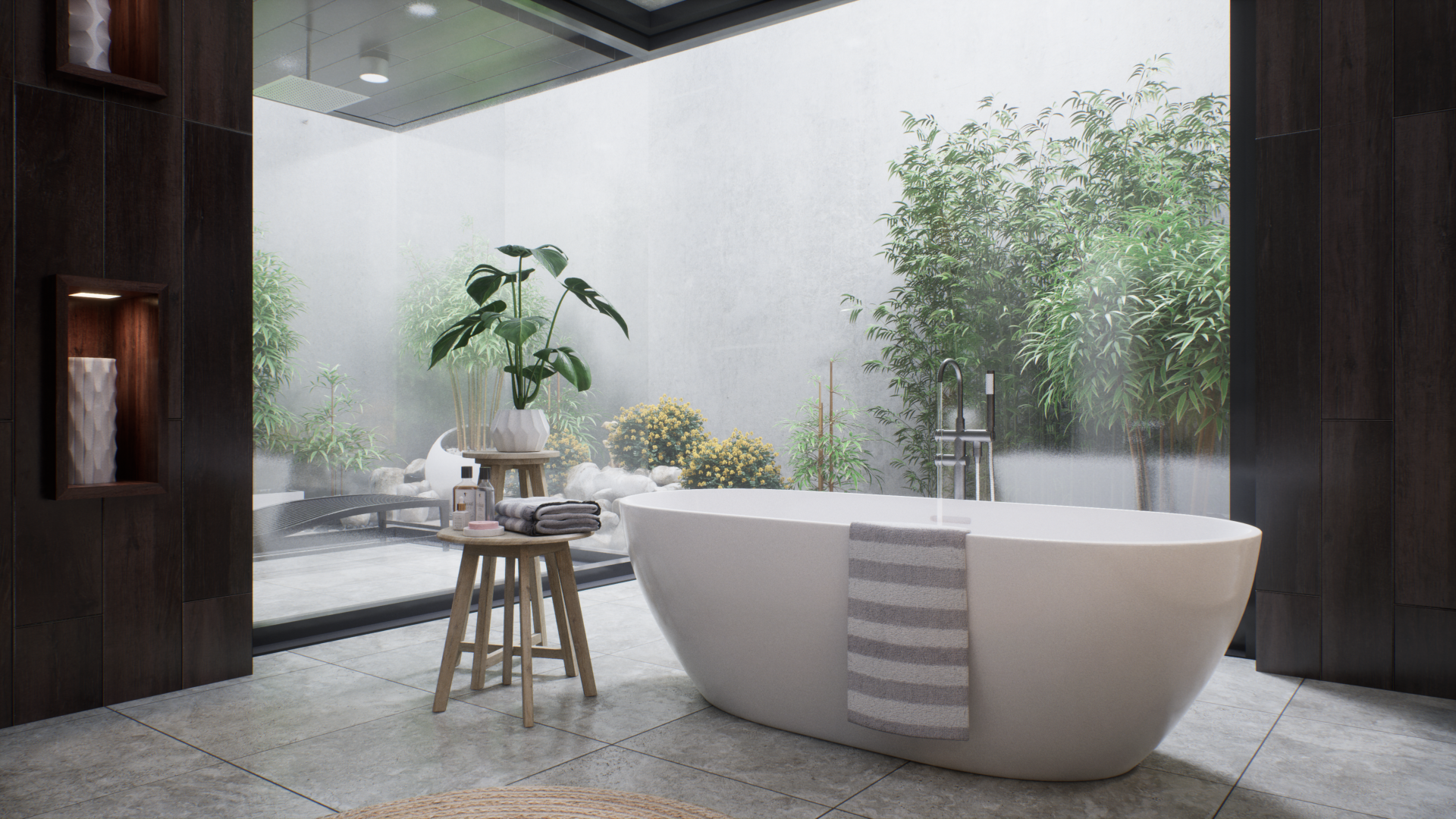 Представленный проект ванной комнаты демонстрирует уникальный дизайн, интегрирующий современные строительные материалы с элементами фитодизайна. В частности, в интерьере предусмотрено создание изолированных зон с растительностью, отделенных от основной площади помещения с помощью стеклянных перегородок, по которым стекают струи воды, что создает эффект погружения в подводный мир. Дизайн интерьера включает в себя использование декоративных композиций из бамбука, а также элементов сада камней, что позволяет интегрировать элементы природного ландшафта в искусственную среду. Эти элементы не только выполняют эстетическую функцию, но и способствуют созданию гармоничного и экологически чистого пространства, которое способствует релаксации и восстановлению психоэмоционального состояния человека.