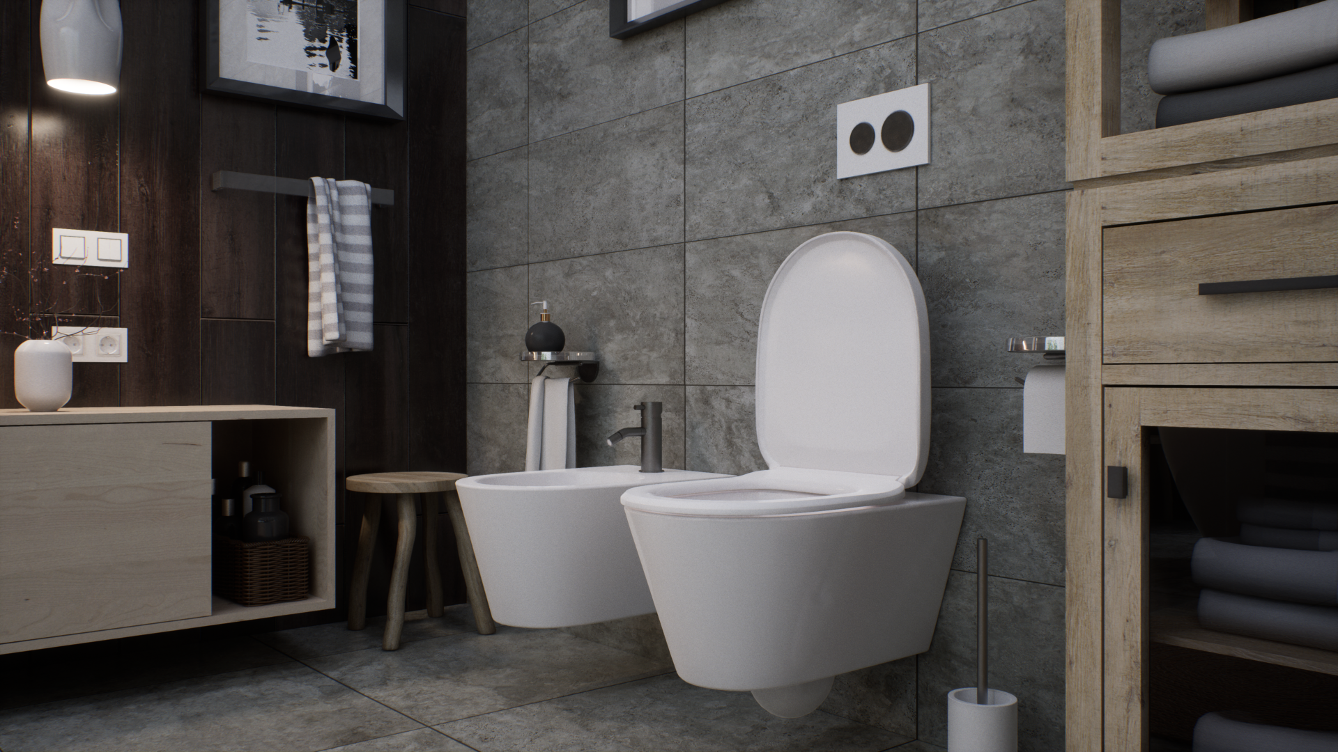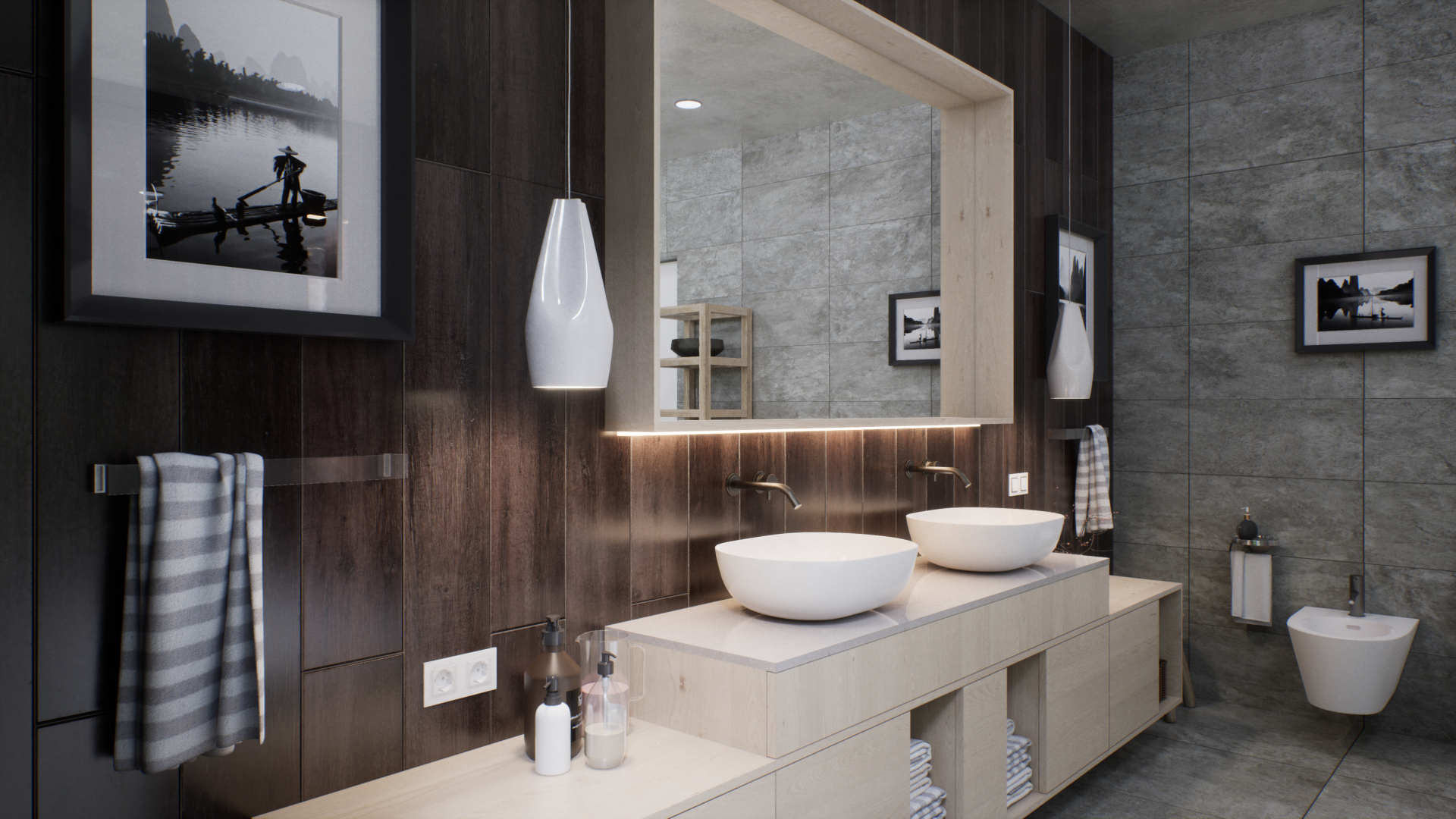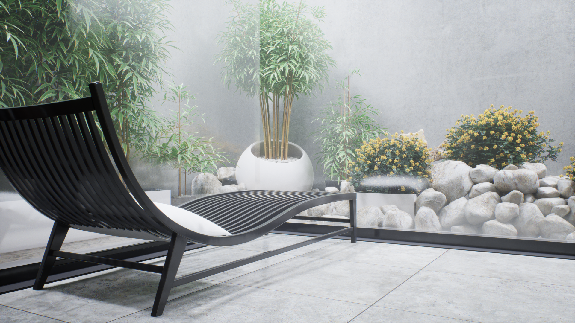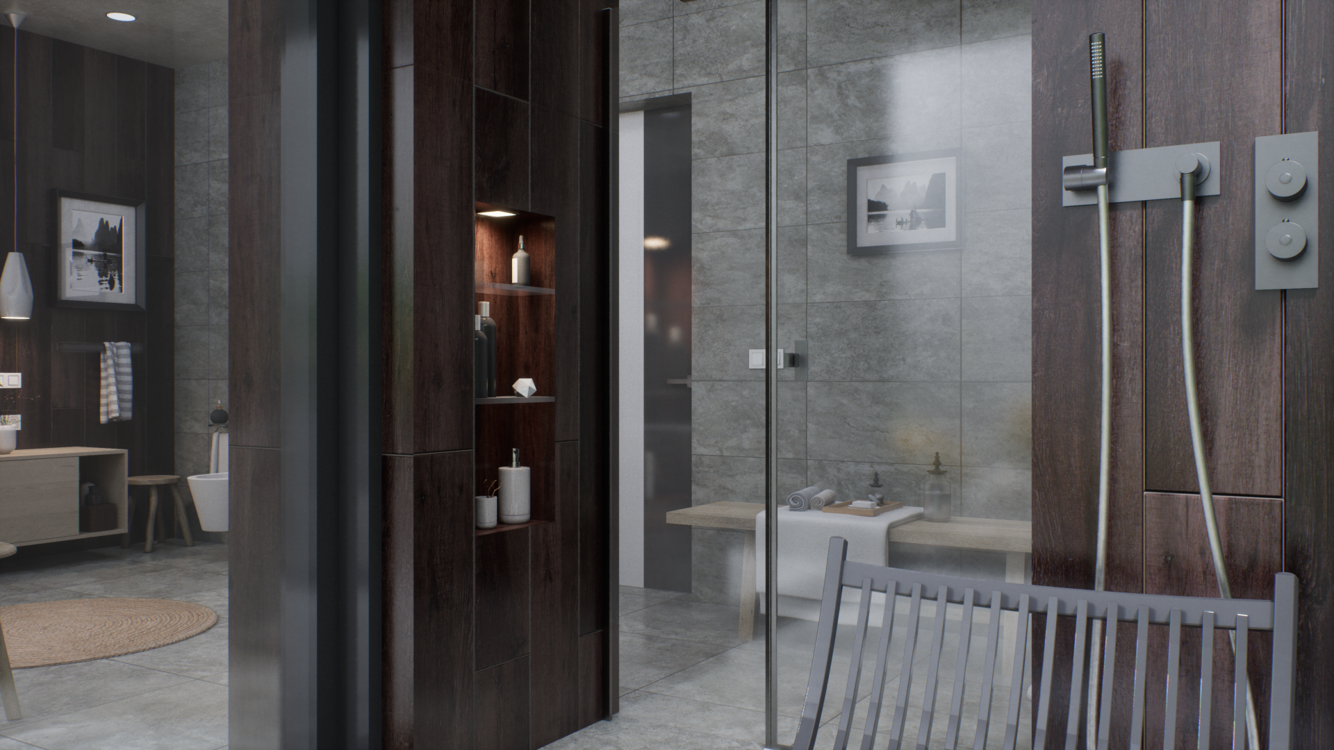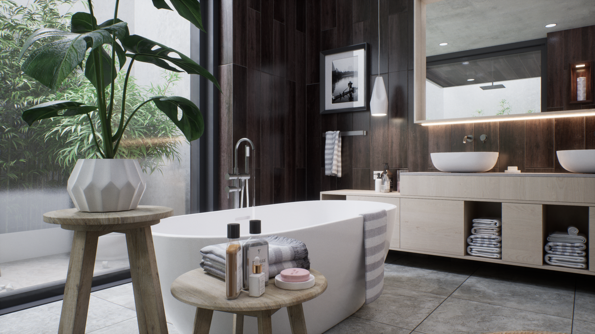 Представленный проект ванной комнаты демонстрирует уникальный дизайн, интегрирующий современные строительные материалы с элементами фитодизайна. В частности, в интерьере предусмотрено создание изолированных зон с растительностью, отделенных от основной площади помещения с помощью стеклянных перегородок, по которым стекают струи воды, что создает эффект погружения в подводный мир. Дизайн интерьера включает в себя использование декоративных композиций из бамбука, а также элементов сада камней, что позволяет интегрировать элементы природного ландшафта в искусственную среду. Эти элементы не только выполняют эстетическую функцию, но и способствуют созданию гармоничного и экологически чистого пространства, которое способствует релаксации и восстановлению психоэмоционального состояния человека.