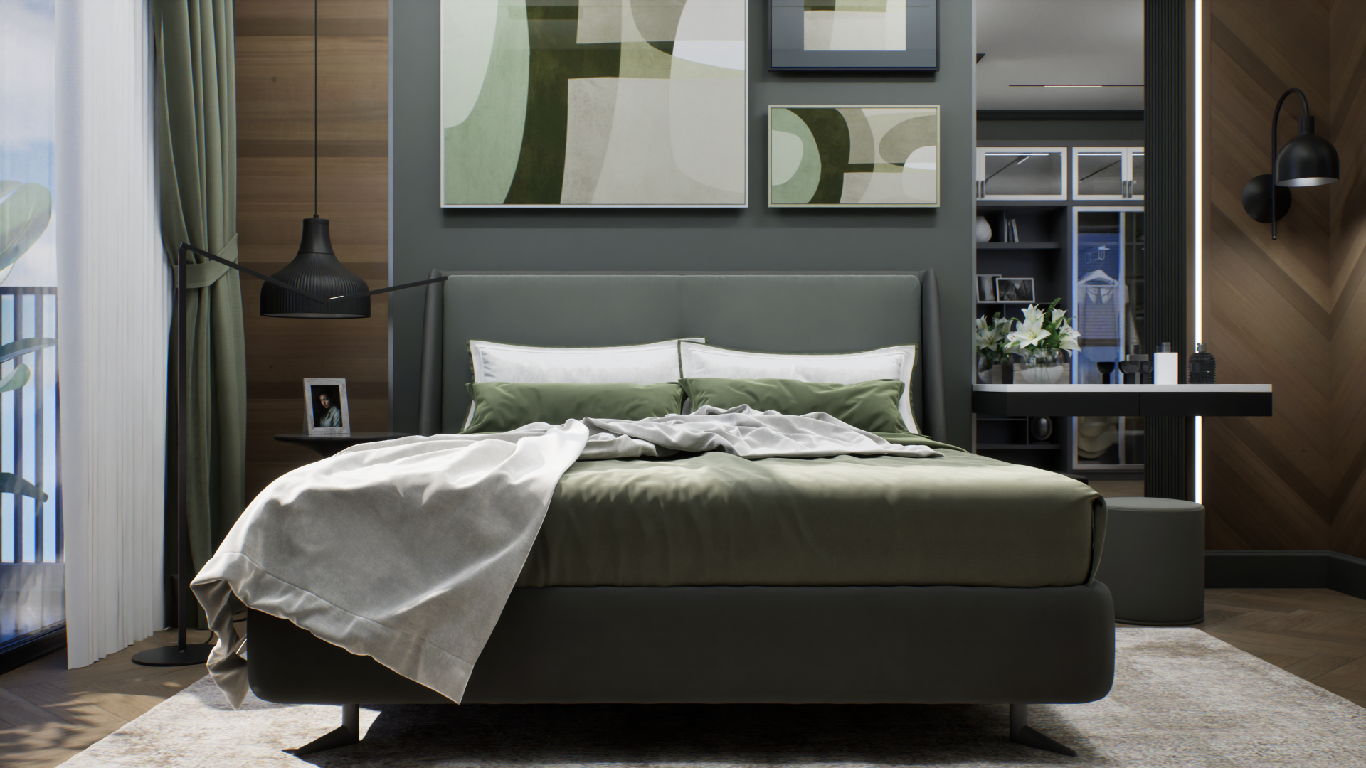 Современная квартира с лаконичным и уютным дизайном. Центральное место в спальне занимает большая кровать с мягким изголовьем в серо-зелёной гамме, дополненная уютным постельным бельём. Интерьер выполнен в минималистичном стиле: функциональная мебель, стильный подвесной светильник, абстрактные картины на стене. Рядом с кроватью — практичный туалетный столик с зеркалом и небольшой пуф. Большие окна с лёгкими шторами наполняют комнату естественным светом, а вид на зелень создаёт ощущение единения с природой.